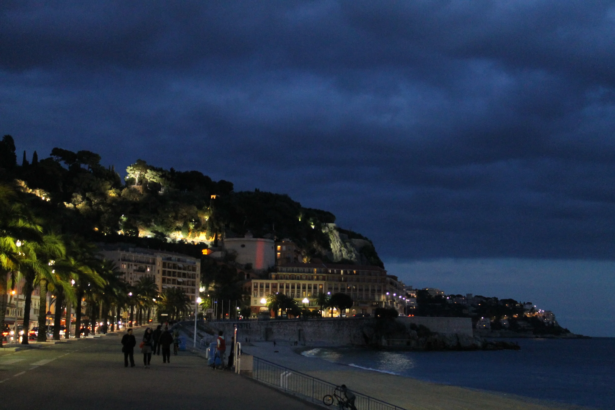 A 12 minute walk and we were standing on the edge of the French Riviera. The beach, while not comfortable to walk on barefoot, is made up completely of round stones that have been tumbled and rubbed smooth by the sea's currents and waves. We sat on the beach with Parc du Chateu illuminated to our left, and the rest of Nice's seaside stretching out to our right. The headlights of the cars driving along the sea's edge looked like a diamond necklace dazzling in the night. We sat there for a while enjoying the sound of crashing waves and the round rocks being pushed and pulled into the ocean with every passing swell.