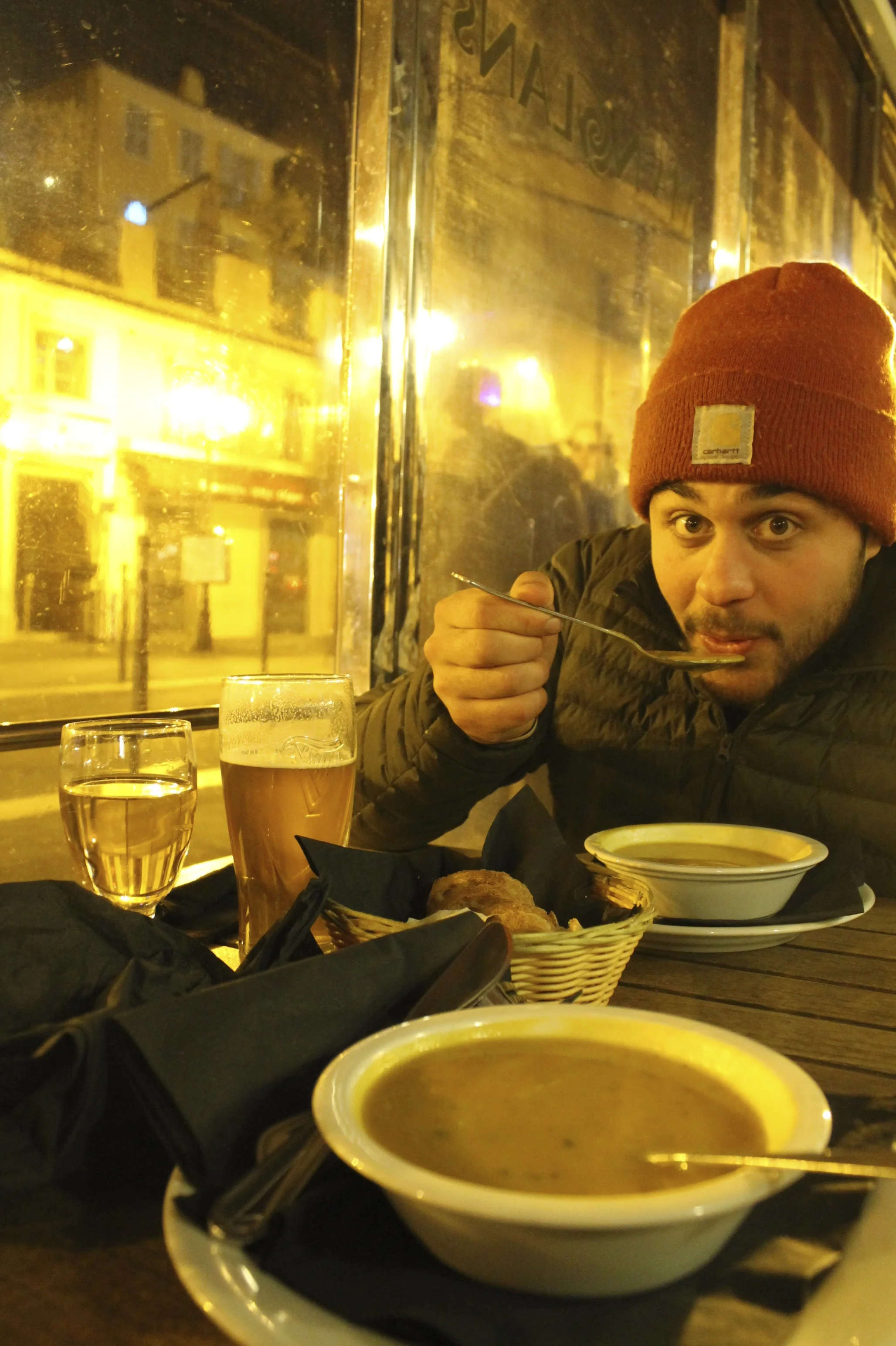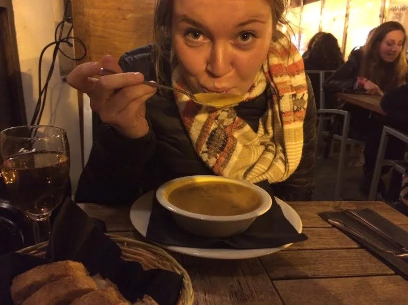 We arrived at Ma Nolan's, an Irish pub, around 7:00 to a rowdy, jam-packed group of soccer fans watching a big Brussels vs Madrid game. We sat on the covered patio and listened to French chants and singing, and ordered our feast. Round 1 was butternut squash soup, which was yummy! Round 2 was what we has been waiting for all day: turkey, gravy, roasted potatoes and sweet potatoes, stuffing, and a hidden piece of ham (not sure why). The final round: pumpkin pie, which unfortunately has a disappointing crust (tasted uncooked). So, alas, we had our thanksgiving meal after a wild goose chase. It wasn't nearly as delicious as the feasts that are prepared with love back home, but it was a fun little taste of home and a great memory for the books!